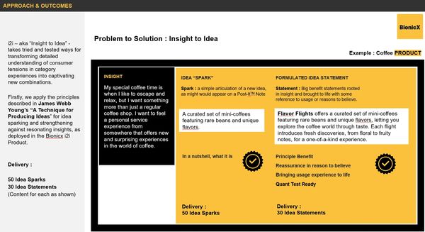 i2i is all about aided imagination—speeding up the ideation phase by acting as both a practitioner and category expert. It transforms consumer problems into initial “Sparks” and develops them into fully-formed big-benefit idea statements. Deliverables in just 10 days.